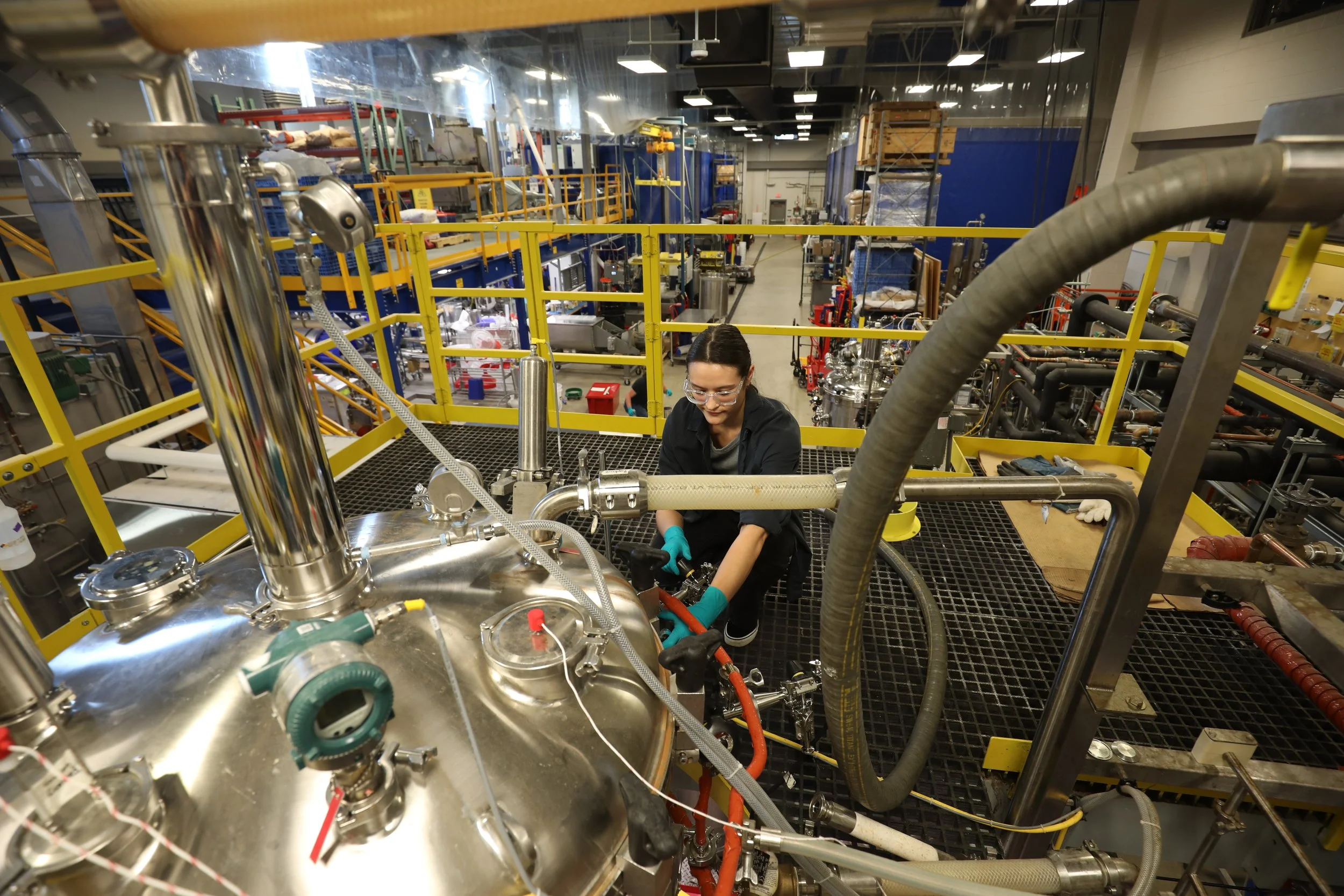 Scaled-up manufacturing of iMicrobes bio-based acrylic acid at IBRL. Credit: Taylor Meredith.