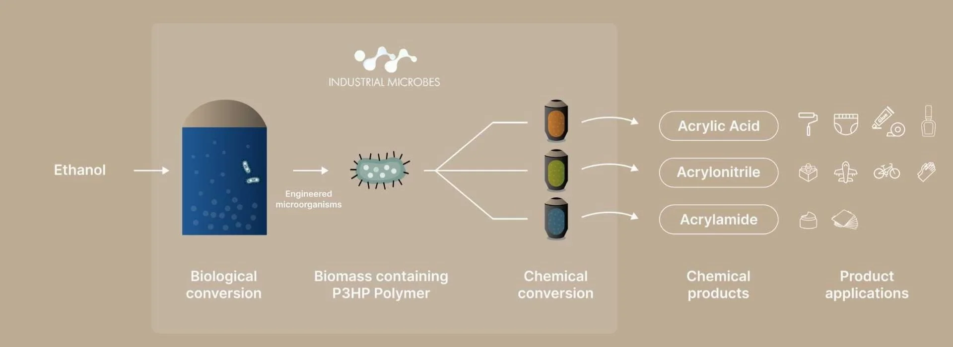 Why not go directly to acrylic acid or soluble intermediates like 3HP? Both 3HP and acrylic acid are reactive, can be toxic to microbes (especially acrylic acid), and are expensive to purify at commercial scale. Our polymer-based intermediate neatly sidesteps these problems, simplifying downstream processing and dramatically cutting purification costs.